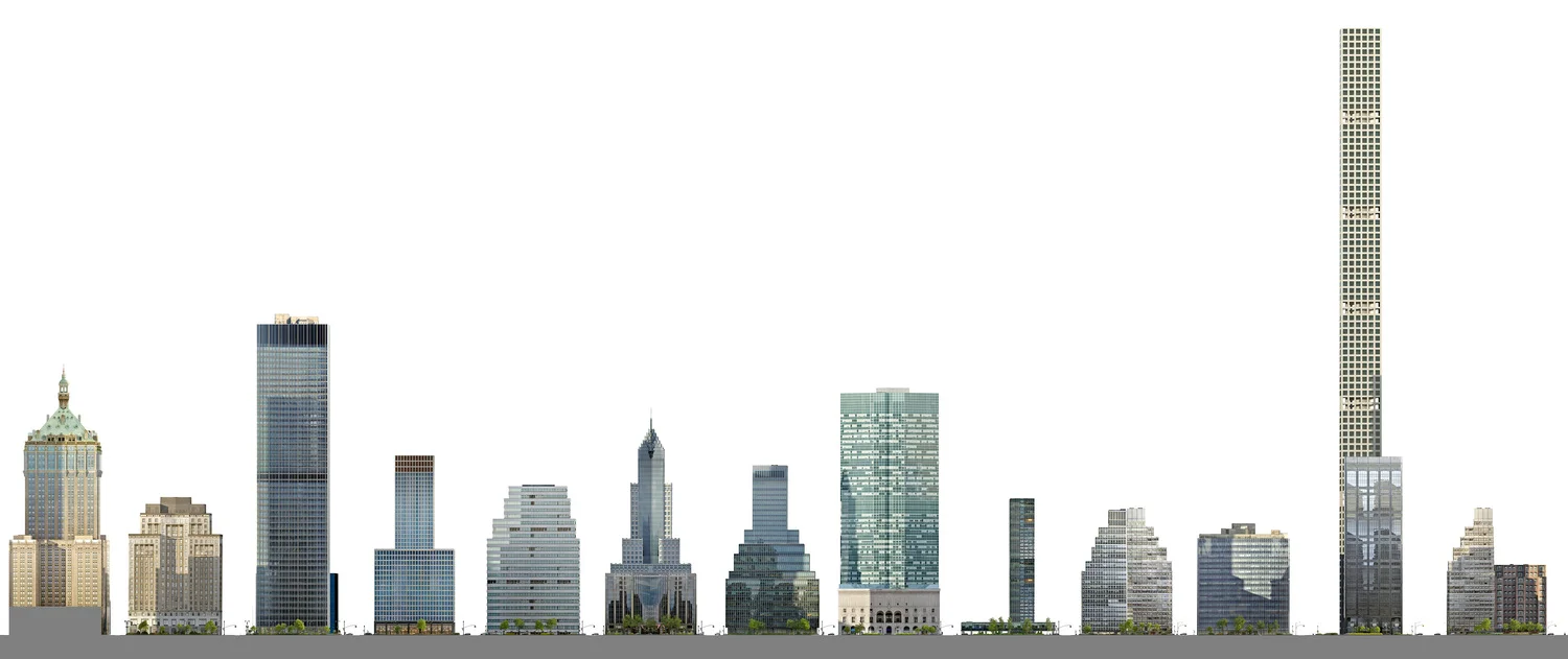 Large format (~14,000 pixel) accurately scaled renderings showing facades and immediate context on either side of Park Avenue in midtown Manhattan. Produced for use in evaluating the visual impact of modifications to certain facades.