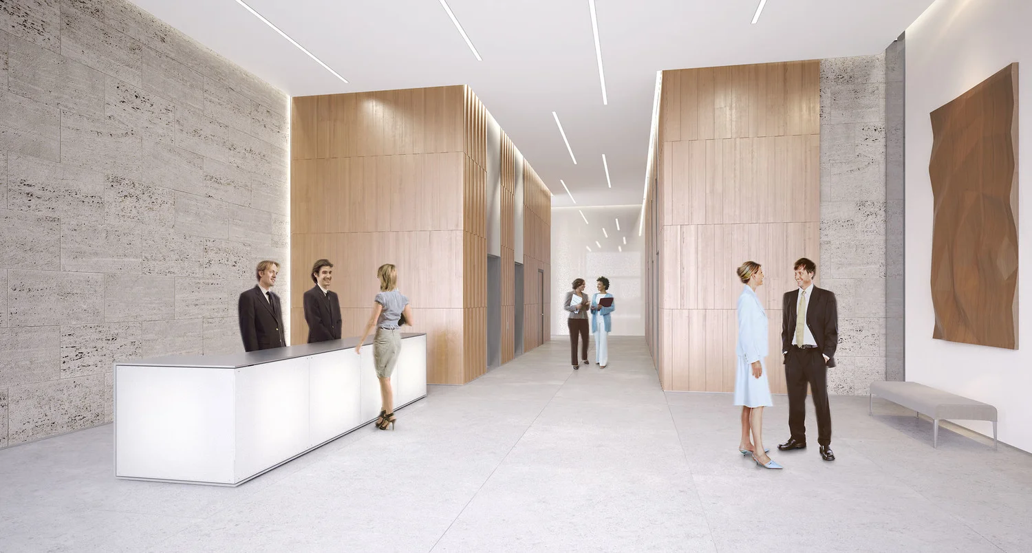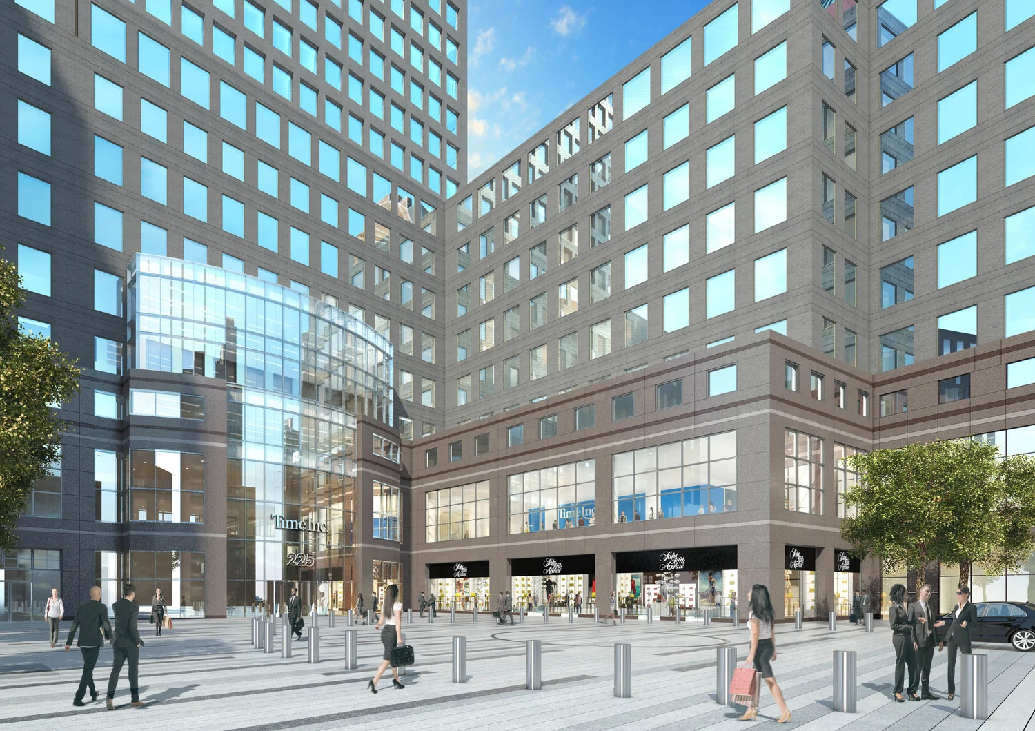 Interior and exterior remodel of Brookfield Place's Liberty Street entrance showing retail and commercial tenant branding opportunities.