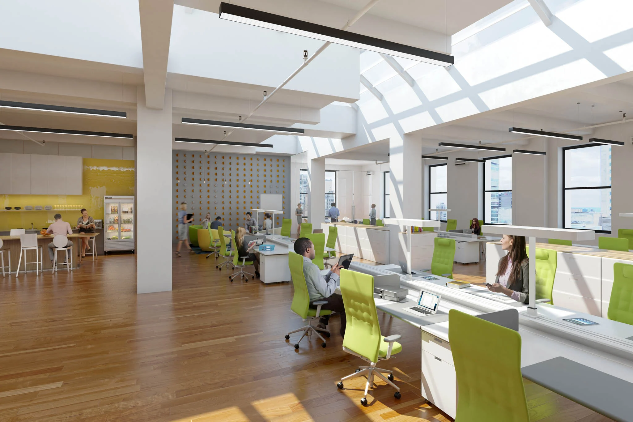 Design presentation and marketing renderings depicting buildout of a typical office floor and conversion of an existing terrace into an outdoor amenity space.